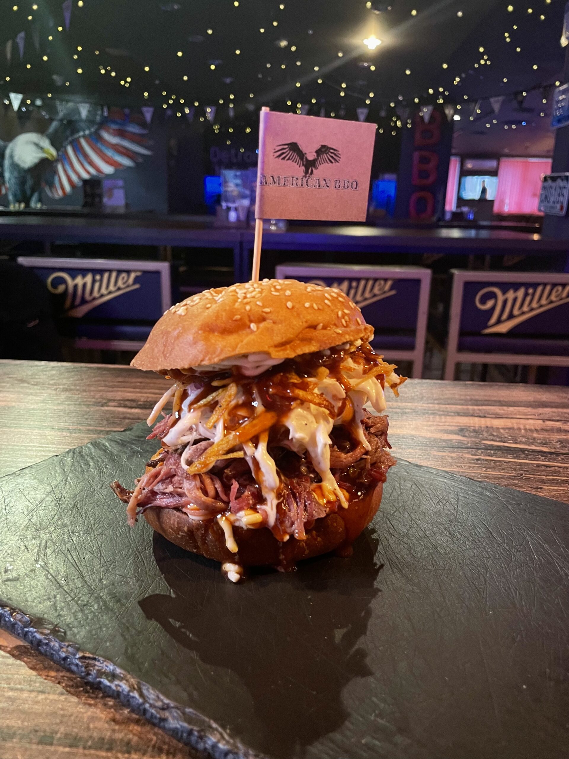 Сочный, нежный бургер с кусочками рваной говядины долгого копчения, салатом coslow,хрустящей картошечкой кристи. все это под невероятно вкусным соусом бербекю
