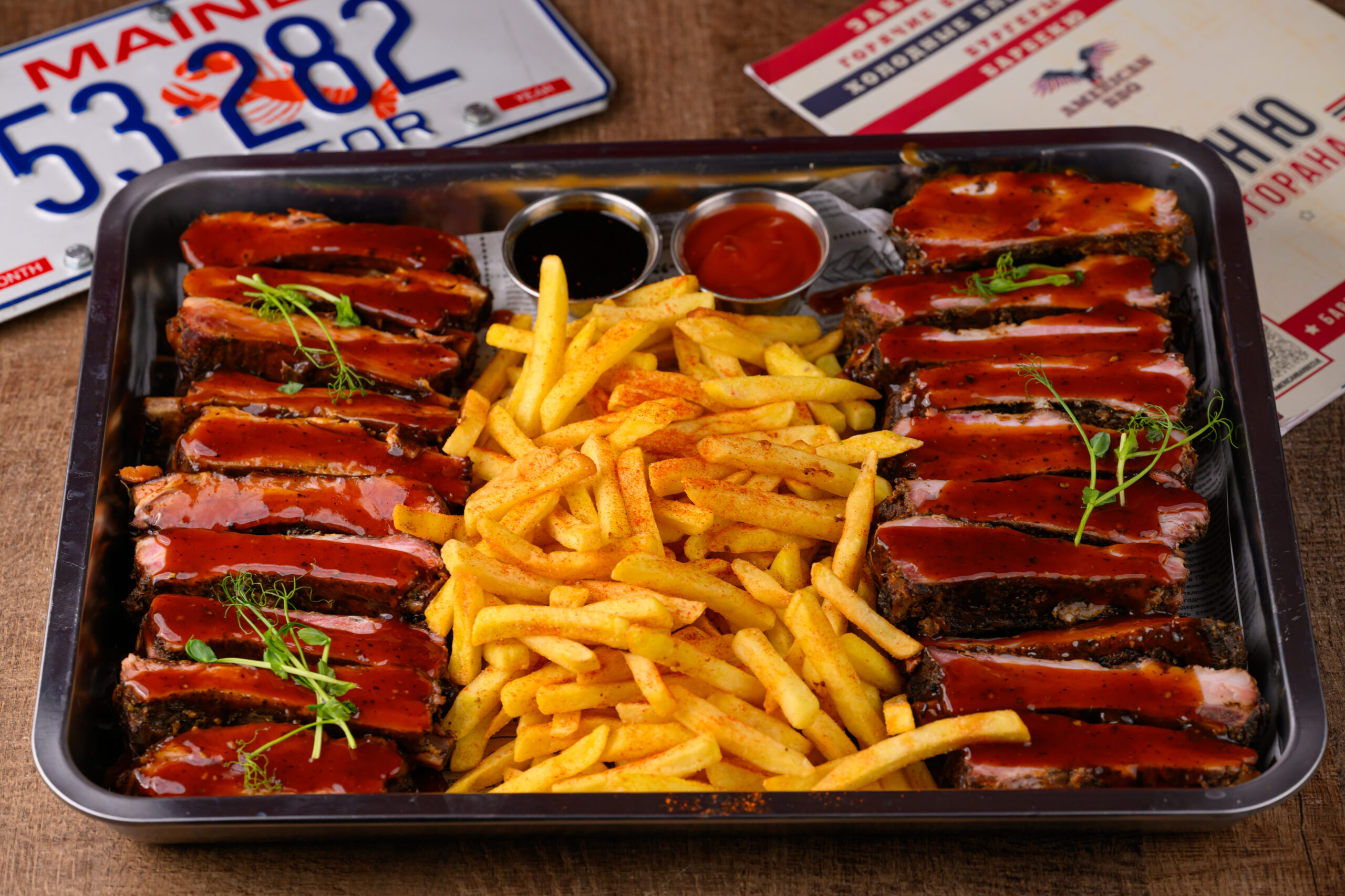 1 кг ребер барбекю, 1 кг ребер медовых, 500 гр картофеля фри, 100 гр соуса на выбор