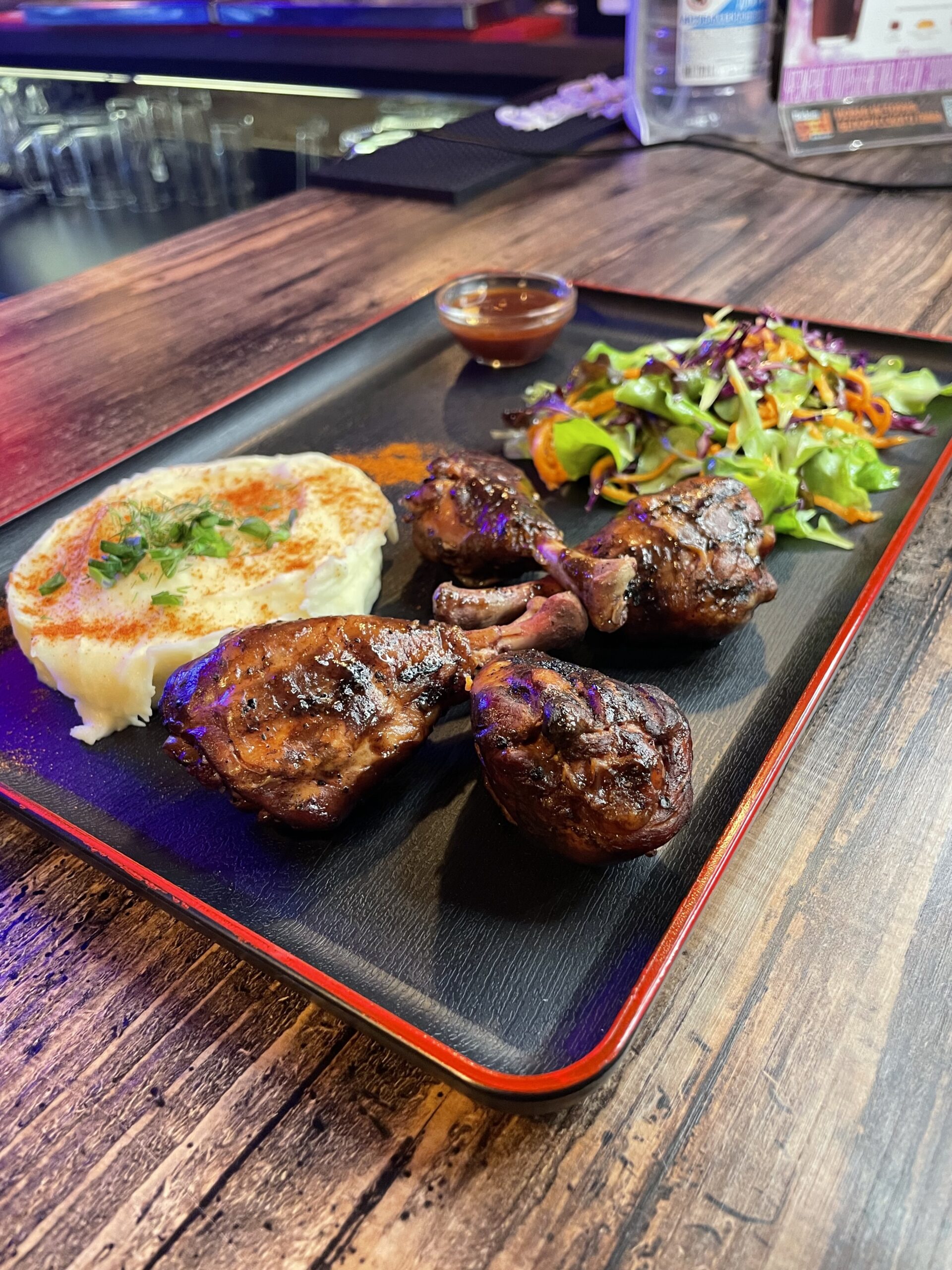 Куриные копченые чупачупсы с картофельным пюре и салатом – 550 гр