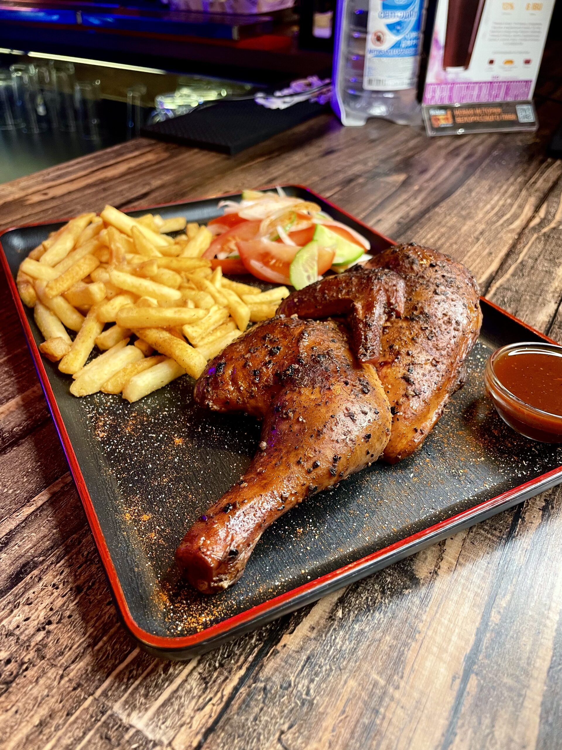 Копченая курица барбекю с картофелем фри и салатом – 1000 гр