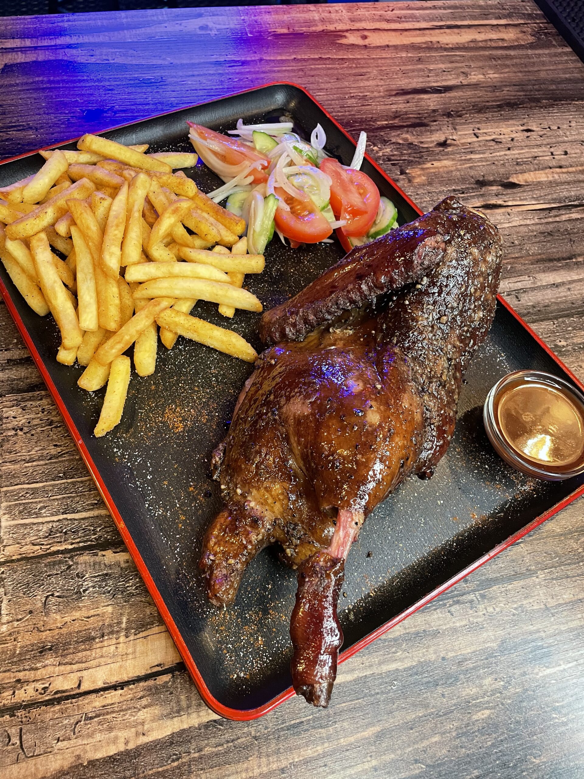 Копченая утка барбекю с картофелем фри и салатом – 1000 гр